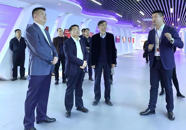 调研组一行领导参观了华云数据的企业展厅,许广彬向调研组详细介绍了华云数据的近年来发展情况以及信创产业实践进展。