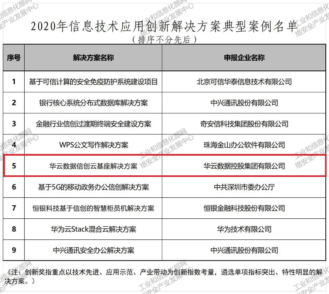 2021年4月28日,华云数据“信创云基座”凭借突出的技术水平成功入围工业和信息化部网络安全产业发展中心发布的“2020年信息技术应用创新解决方案典型案例”名单。