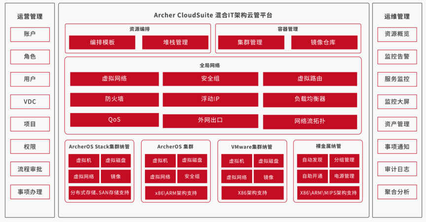 华云数据自研安超云套件Archer Cloudsuite,以此为支撑设计国产混合IT架构云化解决方案。整体采用微服务架构,向下兼容主流国产处理器、服务器硬件,支持开通基于主流国产操作系统的裸金属、虚拟机和容器等类型云资源并提供统一管理, 成为各行各业信创云解决方案实施的基石。