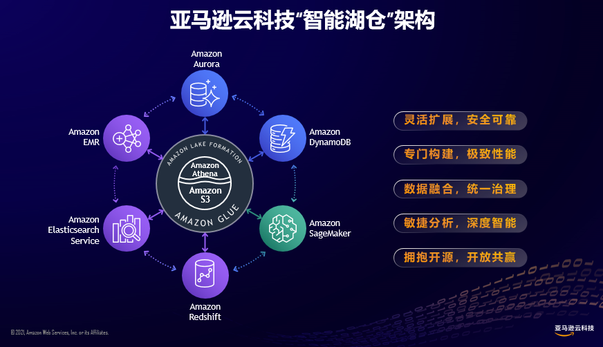 亚马逊云科技在今年上半年推出“智能湖仓”架构,该架构以Amazon Simple Storage Service(Amazon S3)为基础构建数据湖作为中央存储库,围绕数据湖集成专门的“数据服务环”。“智能湖仓”架构具有灵活扩展、专门构建、数据融合、深度智能和开源开放五大特点,不仅打通了数据湖和数据仓库之间数据移动和访问,并且进一步实现了数据在数据湖、数据仓库,以及在数据查询、数据分析、机器学习等各类专门构建的服务之间按需移动,满足客户各种实际业务场景下的不同需求。