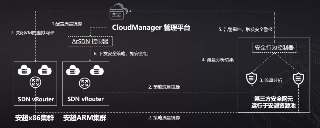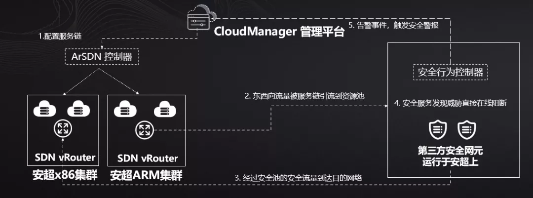 多种安全网元可通过服务链串行接入到安超云网络中,当发现威胁流量时,可以立即阻断威胁流量,并对云管平台发出安全警报。
