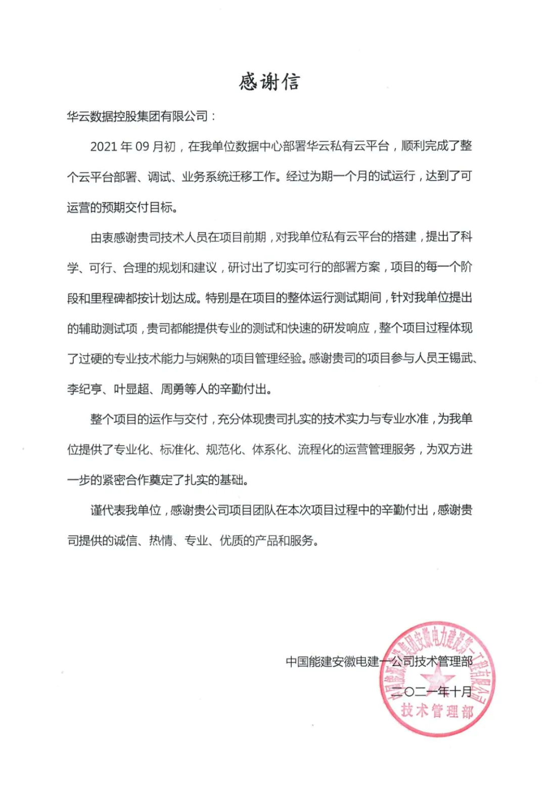 也是因为华云数据在项目中的辛勤付出。日前,华云数据收到中国能建安徽电建一公司发来的感谢信。感谢华云数据专业的技术能力与项目管理经验,让项目的每一个阶段和里程碑都按计划达成。他们表示:“特别是在项目的整体验收测试期间,针对我们提出的新增测试项,华云数据都能提供专业的测试和快速的响应,并给予增强平台性能的合理化建议,感谢贵司交付人员的辛勤付出。”