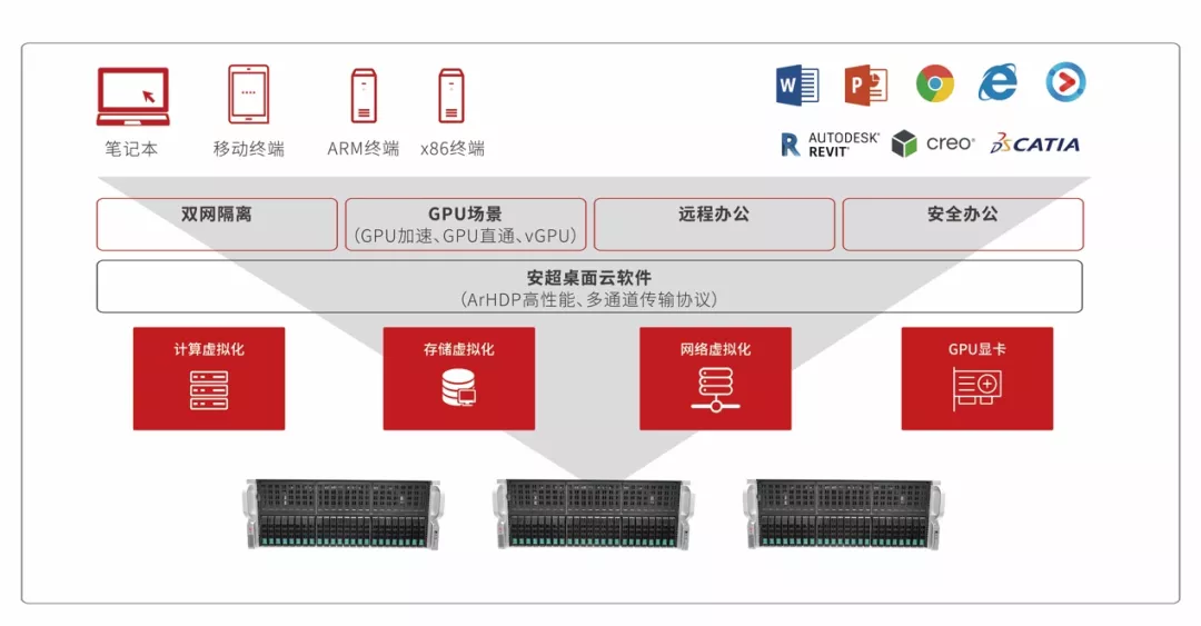 普通的桌面云已经无法满足用户在图形化设计、3D渲染等领域的需求,而安超桌面云提供了全芯全生态的高性能桌面云一体化解决方案,方案中提供的全GPU加速的特点可以满足在轻度、中度以及重度使用场景上均体现出超过以往传统桌面云的流畅性和高效性。