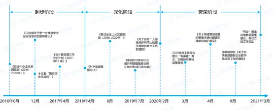 从市场环境来看,中国政府自2016年起,便开始大力鼓励企业数字化转型,推动企业全面上云。国家在《“十四五”数字经济发展规划》中指出,实施中小企业数字化赋能专项行动,支持中小企业从数字化转型需求迫切的环节入手,加快推进线上营销、远程协作、数字化办公、智能生产线等应用,由点及面向全业务、全流程数字化转型延伸拓展。鼓励和支持互联网平台、行业龙头企业立足自身优势,帮助传统企业和中小企业实现数字化转型。
