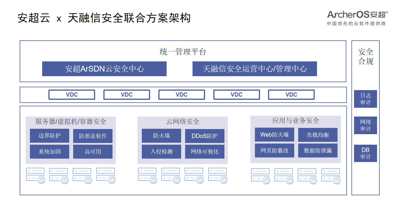 安超云&天融信联合打造数据中心云安全资源池解决方案,以安超云的云平台为底座,将底层异构的计算、存储、网络资源与天融信的防火墙、WAF、抗DDoS、IPS/IDS、网页防篡改、日志审计、数据库审计等云安全实例深度对接,构造云安全资源池,帮助用户打造全方位可信赖安全屏障。