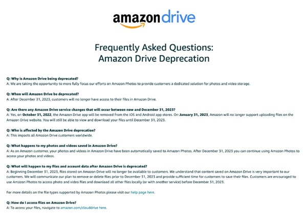 Amazon Drive账户中的照片和视频将自动保存到Amazon Photos。不过对于所有“不是图片或视频的文件”,用户需要在服务关闭前将其下载至本地。其中,Amazon Drive的iOS和Android客户端将于今年10月31日下架。明年1月31日开始,Amazon Drive将不再支持新的上传。
