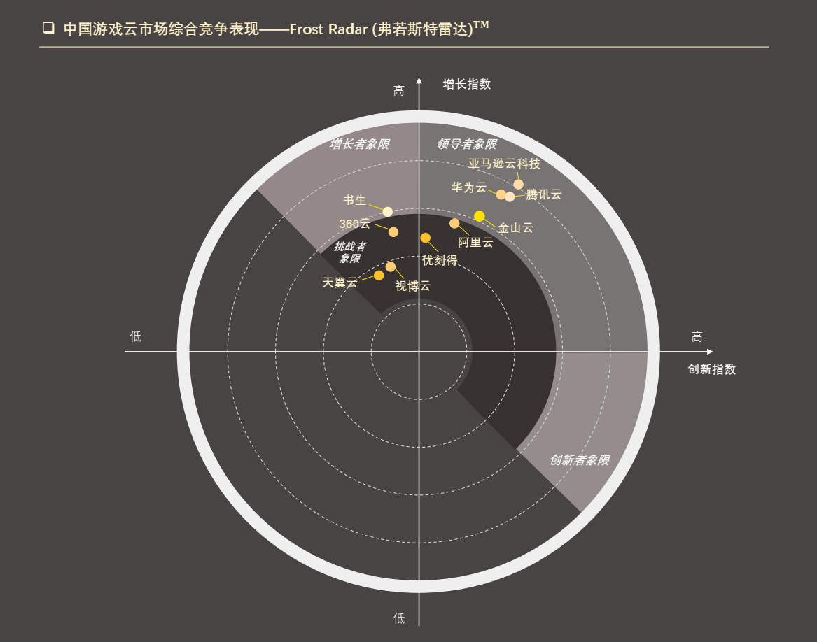 在“中国游戏云市场综合竞争表现——Frost Radar(弗若斯特雷达)“中,云服务商的竞争力由“创新指数”和“增长指数”得出。纵坐标代表的“增长指数”衡量云服务商的游戏云服务在基础功能成长、基础性能提升、市场拓展能力等方面的竞争力。横坐标代表的“创新指数”衡量云服务商在游戏云服务领域的创新能力,包括功能拓新、技术纳新、理念革新等方面。