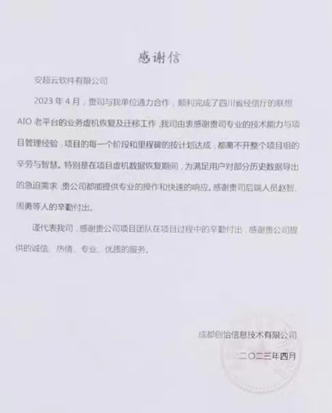 日前,安超云收到来自成都创怡信息技术有限公司发来的感谢信。感谢安超云与其通力合作顺利完成了四川省经信厅的联想AIO老平台的业务虚机恢复及迁移工作,为项目的顺利推进提供坚实保障。