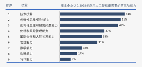 尽管在职员工对学习人工智能技能兴趣盎然,但随着这项技术在工作中的应用越发深入,部分重复性高、机械性强的工作,正逐渐被这项技术所取代,这也引发了他们对人工智能是否会取代人类的担忧。然而,研究也发现,除了技术技能(54%)外,企业认为创造性思维(51%)和批判性思维(49%)等软技能也是员工在2028年使用人工智能工具时最需要的能力。