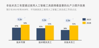 73%的企业和员工都认为,改善工作流程是人工智能助力提升生产力的最大优势,其次是任务自动化(70%)。为了更广泛地提升生产力,预计未来五年,从技术专家到非技术类员工都将加大对人工智能工具的应用。其中,预计非技术类员工的人工智能工具使用率将增加1.5倍,比技术专家(增加1.2倍)和技术相关人员(增加1.2倍)都增长得更多,因此他们也有望获得最显著的生产力提升效果。