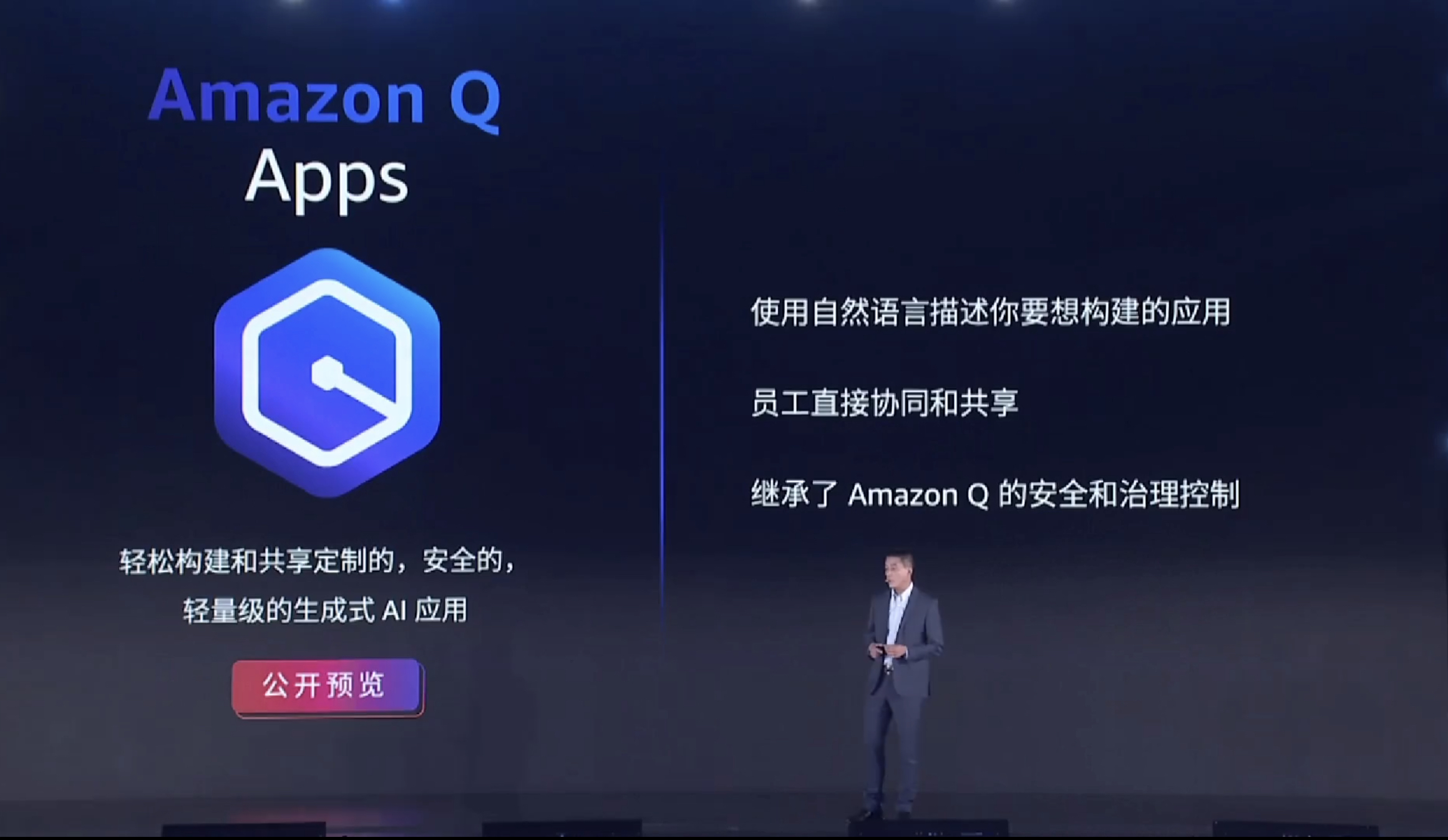 其中,新发布的Amazon Q Business 的Amazon Q Apps 帮助每位员工从对话到构建生成式AI驱动的应用程序只需几秒钟,员工可以用自然语言描述他们想要的应用程序类型,或者只需告诉 Amazon Q Apps 从 Amazon Q 帮助解决问题的对话中执行即可。