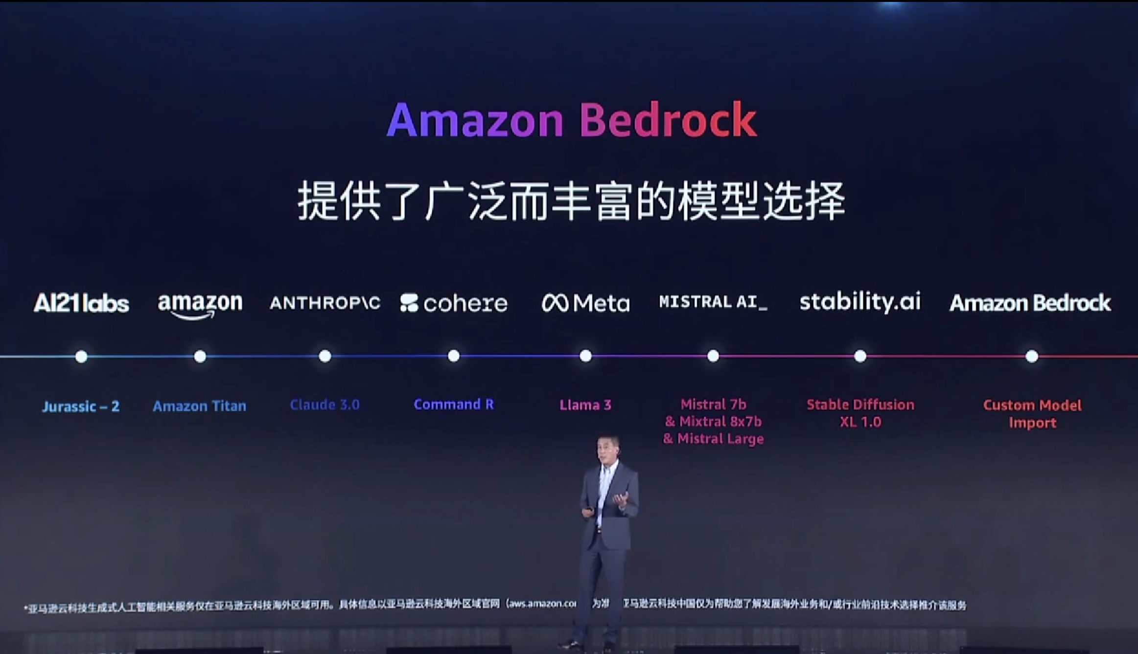 Amazon Bedrock是一项全面托管的服务,用户无需管理任何基础设施,可以通过完全一致的API去访问包括Anthropic、Meta、Mistral AI、Stability AI等等基础模型。