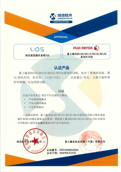 (2020年 7月23日,北京)今天,富士施乐(中国)有限公司宣布共70款机型获得国产操作系统统信UOS的兼容认证,其中包括新一代ApeosPort旗舰智能型数码多功能机、多功能一体机/打印机、生产型数字印刷系统。这是继获得中标麒麟、龙芯和兆芯兼容认证后,富士施乐产品获得的又一国产操作系统兼容认证,标志富士施乐(中国)全面支持IT国产化,积极推进全线产品与中国国产操作系统和中国芯产品兼容互认的又一有力举措。