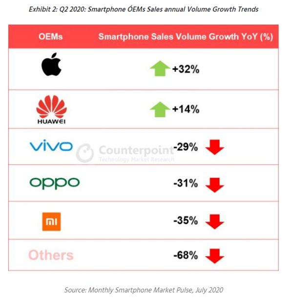 Counterpoint的数据显示,二季度,苹果在国内渠道销量为740万部,同比增长32%,远远好于分析师的下滑1%预期。从绝对数量上来说,华为凭借3660万部的渠道销量仍高居第一,同比也实现了14%的增长,但其它品牌则出现不同程度下滑。
