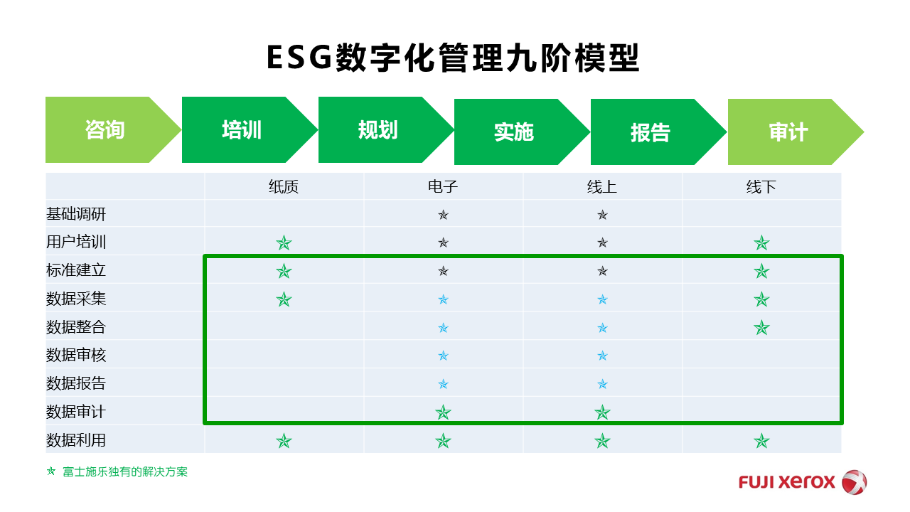 此外,利用独有的“ESG数字化管理九阶模型”,富士施乐可根据企业的规模、行业、管理水平定制适合的数字化管理方案及服务组合,帮助企业实现从咨询调研、培训、标准建立、数据采集、数据整合,到数据审核、数据报告、数据审计和数据利用的全流程数字化的ESG高效管理。