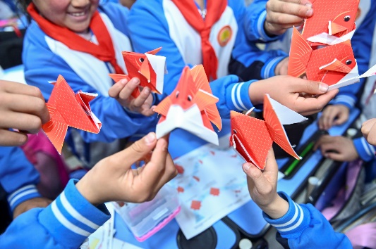 讲座之后就是学生们最爱的动手环节:手工制作课!课堂上学生们可以体验佳能 Creative Park1趣印乐园带来的海洋折纸。佳能趣印乐园里有许多海洋生物的素材,学生们最喜欢的还是这两条可爱的小金鱼,小金鱼折法不复杂,孩子们一学就会,玩的不亦乐乎。