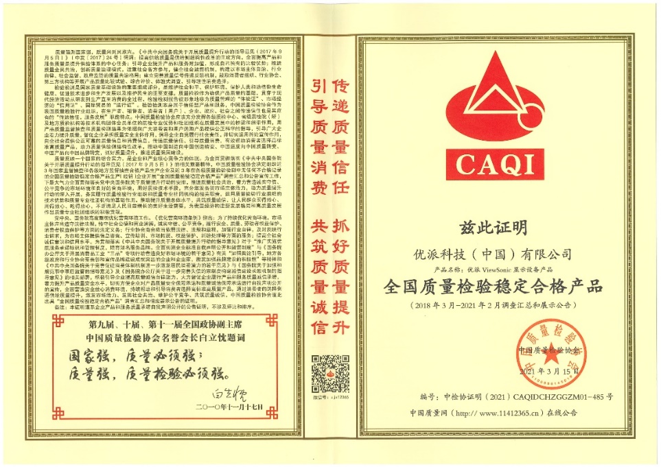 近日,在中国质量检验协会组织承办的2021年“3·15”国际消费者权益日“产品和服务质量诚信承诺”主题活动中,优派(ViewSonic)科技持续发力,凭借先进的技术、可靠的产品质量,再度获得由中国质量检验协会颁发的“全国产品和服务质量诚信示范企业”“全国质量检验稳定合格产品”荣誉证明证书。
