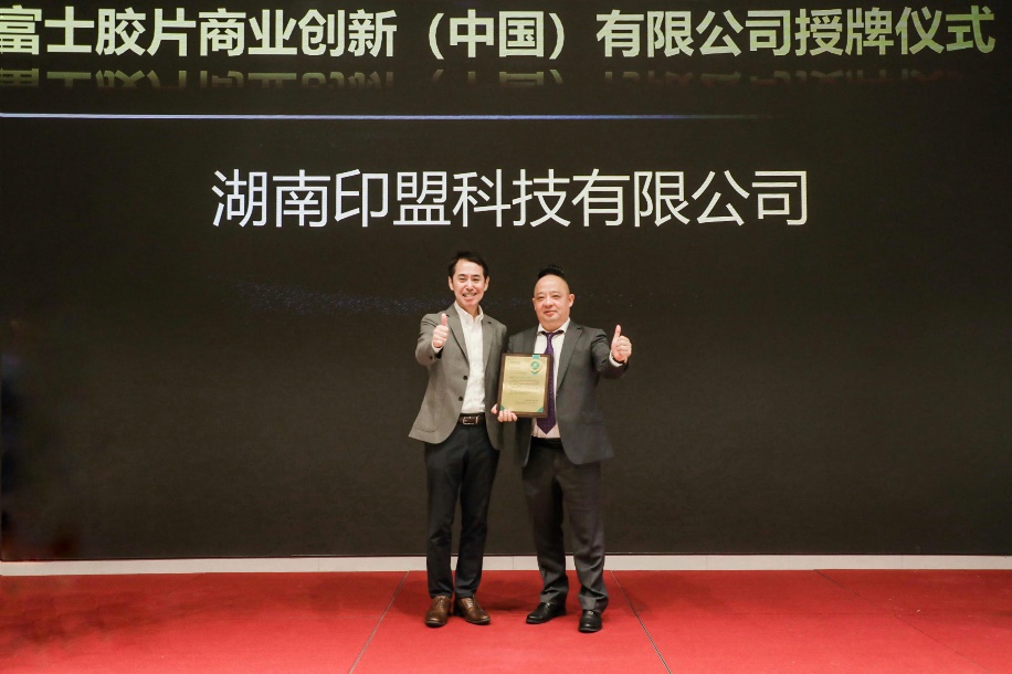 富士胶片商业创新(中国)有限公司董事长内藤昌继(左)为湖南印盟科技有限公司授牌
