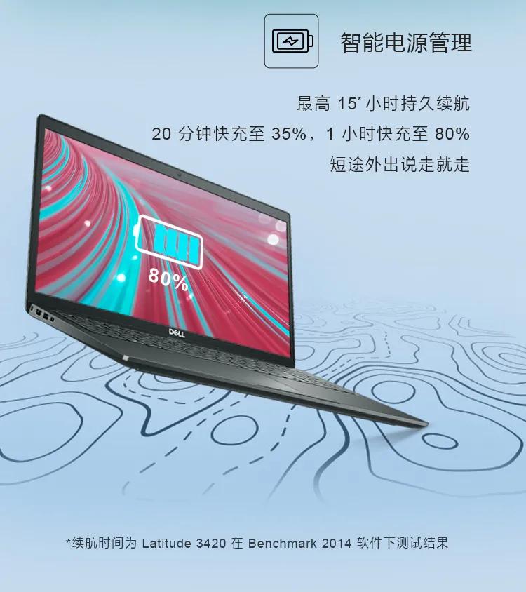 当然,电量焦虑是很多职场人士的共同痛点。戴尔Latitude 3420最高15小时持久续航,它具备的快速充电功能能够实现20分钟快充至35%,1小时快充至80%。