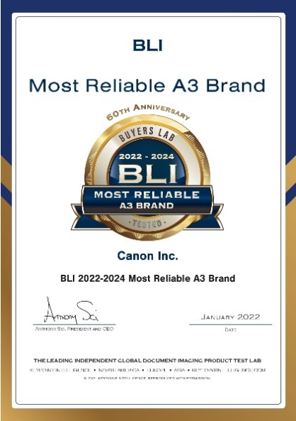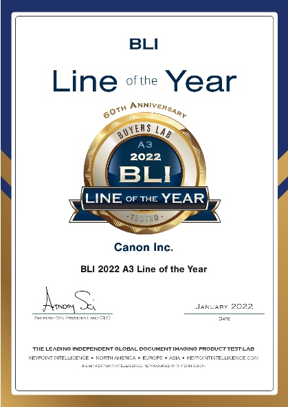日前,佳能*1多功能数码复合机imageRUNNER ADVANCE DX(以下简称:iR-ADV DX)系列产品凭借出色的性能表现和稳定可靠、快捷高效等多项优势斩获由国际权威测试认证机构Keypoint Intelligence*2颁发的买家实验室*3(以下简称:BLI)“BLI 2022 A3产品线年度奖”(BLI 2022 A3 Line of the Year),这也是佳能在过去七年中第五次获得A3 产品线年度奖。同时佳能还获得了“BLI 2022-2024最值得信赖A3品牌奖”(BLI 2022-2024 Most Reliable A3 Brand)。
