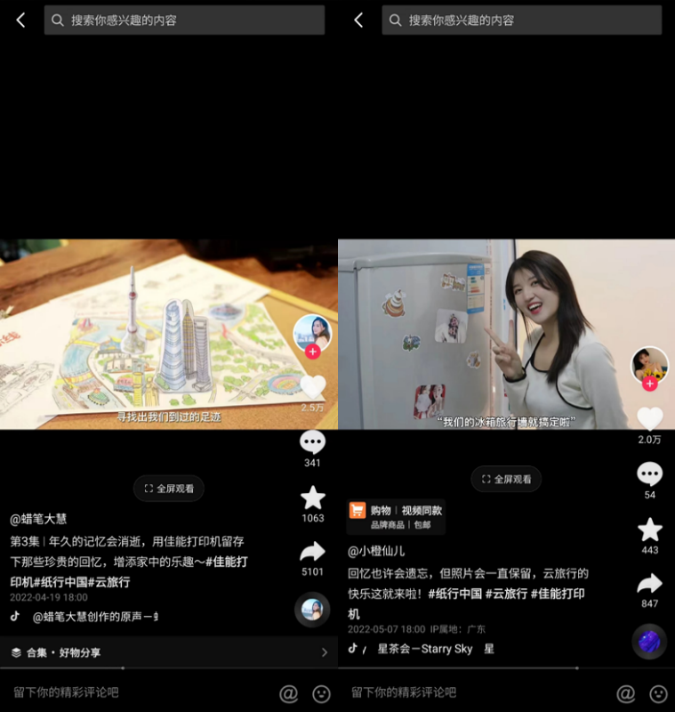 此外,佳能打出精彩还在抖音发起了#纸行中国#共创大赛。通过佳能打印机输出制作城市作品后,不妨拍摄成精美的短视频,投稿参加活动,在增加乐趣的同时,还有机会获得随机照片纸盲盒。 参与方式也非常简单,5月9日-5月28日期间,在抖音平台发布短视频,并在文案中加上#纸行中国@佳能打出精彩,就可以啦。