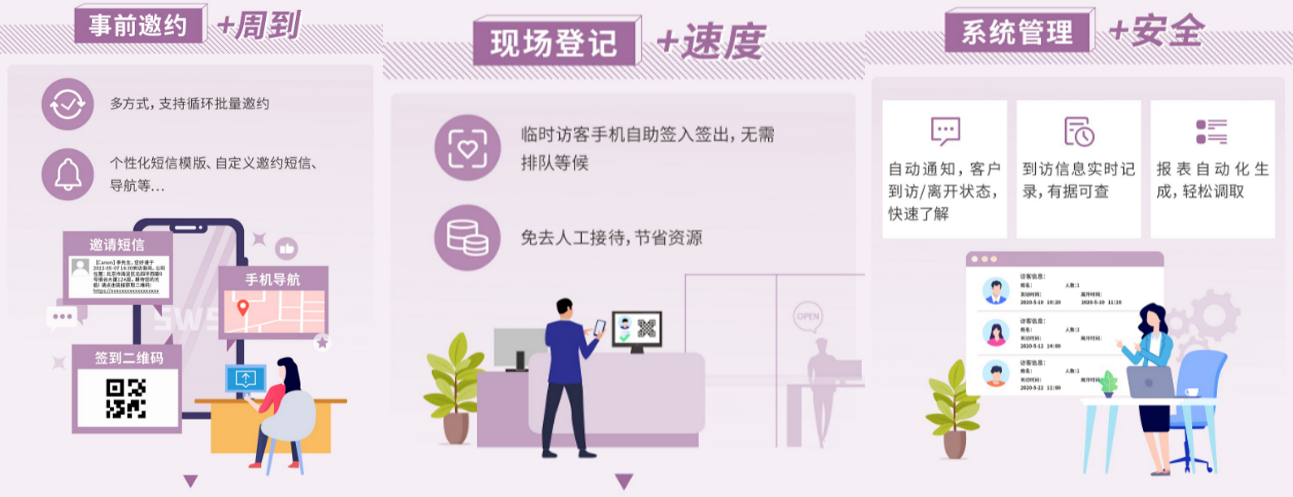 新推出的访客管理系统,整合了一整套完备的软硬件系统。在功能上,支持事前邀约和现场预约两种场景。访客拜访前可以由公司员工在系统上进行邀请,邀约后,一封带有详细会议信息的邮件或短信邀请函就会发送给访客,用户点击链接即可获得签到二维码。这封邀请函内含拜访地的地址,并可以使用手机进行导航。为了应对大批量,高频访客需求,该系统支持可循环邀约、批量邀约。