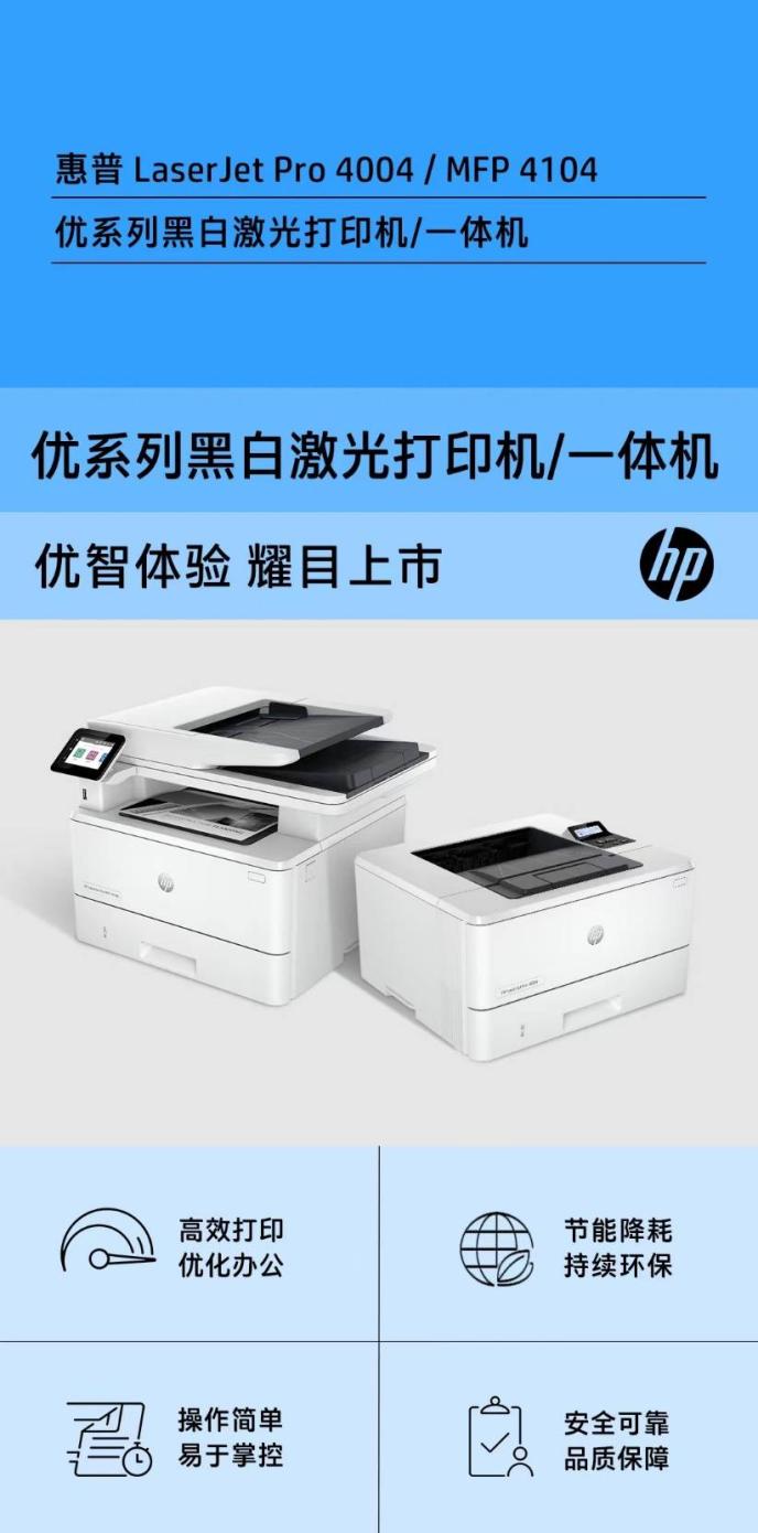 惠普此次发布的“优”系列黑白激光打印机/一体机,包含4104系列及4004系列产品,专为工作组级用户打造,为不同行业领域的企业提供高效打印、易于操作、安全可靠、节能环保的智能办公体验,其具体产品特性如下: