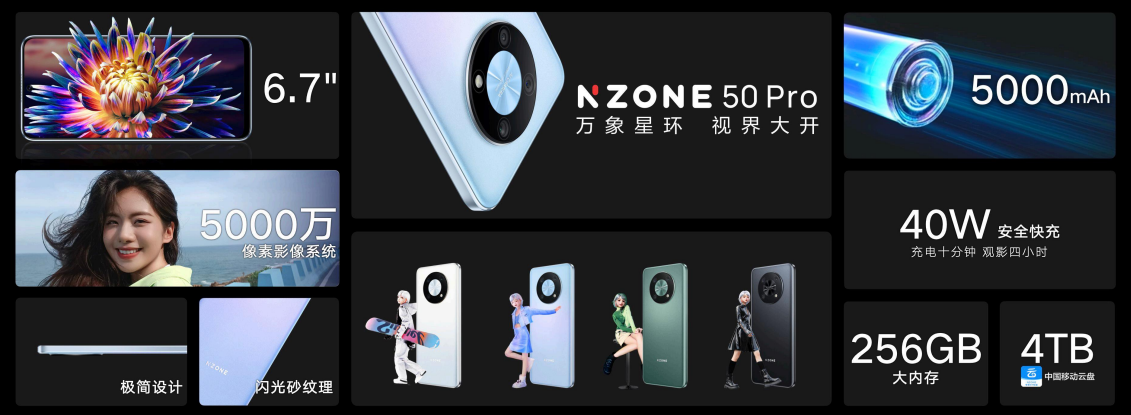NZONE 50 Pro是中国移动NZONE品牌发布的第四款5G手机,搭载联发科技7nm制程工艺5G SoC,拥有6.7英寸超大直屏,5000 mAh +40W超级快充超能续航,后置5000万像素AI三摄超清影像,最高256GB存储内存+4TB中国移动云盘权益,是中国移动为年轻人量身打造的高性价比5G潮机。