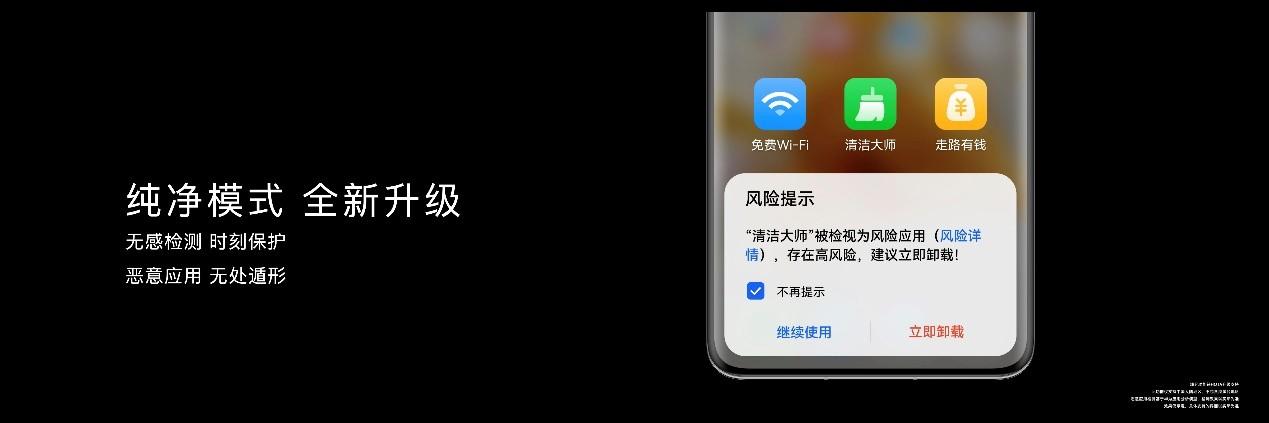在应用生态方面, HarmonyOS 3以其极高的隐私安全保护标准和管控框架,有序管控应用的安装与运行。在纯净模式下,只有通过华为应用市场安全检测和认证的应用才可以安装和运行,并由应用管控中心智能识别应用的风险行为。此外,该模式还新增“增强防护”功能,禁止安装从非华为应用市场的来源下载、以及未通过渠道和应用双认证的应用安装包,进一步避免用户接触到风险应用。