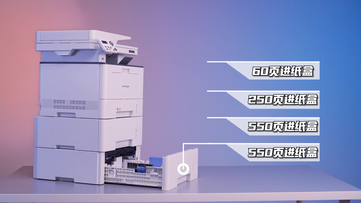 值得一提的是,奔图BM5100ADW除了标配的250页普通进纸盒和60页的多功能进纸盒,还可选配两层550页的进纸盒,纸张输入量可以达1410页,随机配有高达30000页鼓组件和6000页的粉盒,后期粉盒可选3000页、6000页、或者15000页的超大容量粉盒,可以灵活选择,避免频繁加纸、更换耗材,减少行政人员维护的各项成本。