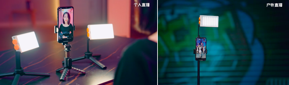 智云五倍M40口袋灯不仅拥有超乎传统口袋灯的高亮度,还拥有能够360°旋转的可调节支架,通过1/4螺口外接通用脚架可随心摆放,快速搭建简单的直播补光场景。个人直播时,可使用多个智云口袋灯外接小型支架放到桌面上,作为主光打亮主播面部,让主播肤色更加明亮;在大空间进行直播或户外直播时,可根据空间场地情况使用多个智云口袋灯搭建主光或辅光。凭借着易于拼接拓展的轻巧属性,智云口袋灯轻松满足多样化直播场景。