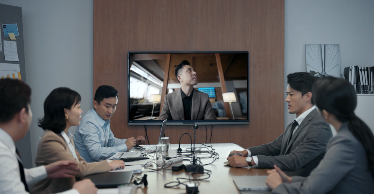 在这支华为“同路者计划”活动视频中,视频前半部分内容真实还原了在传统商务洽谈时,老板身在外地与公司高层员工、客户远程视频讨论项目合作实施方案的场景。员工在会议室一团乱麻的线缆中手忙脚乱寻找HDMI线连接电脑投屏,但是HDMI线又无法直连电脑,员工开始慌张的找转接头,终于将笔记本与显示屏成功连接。