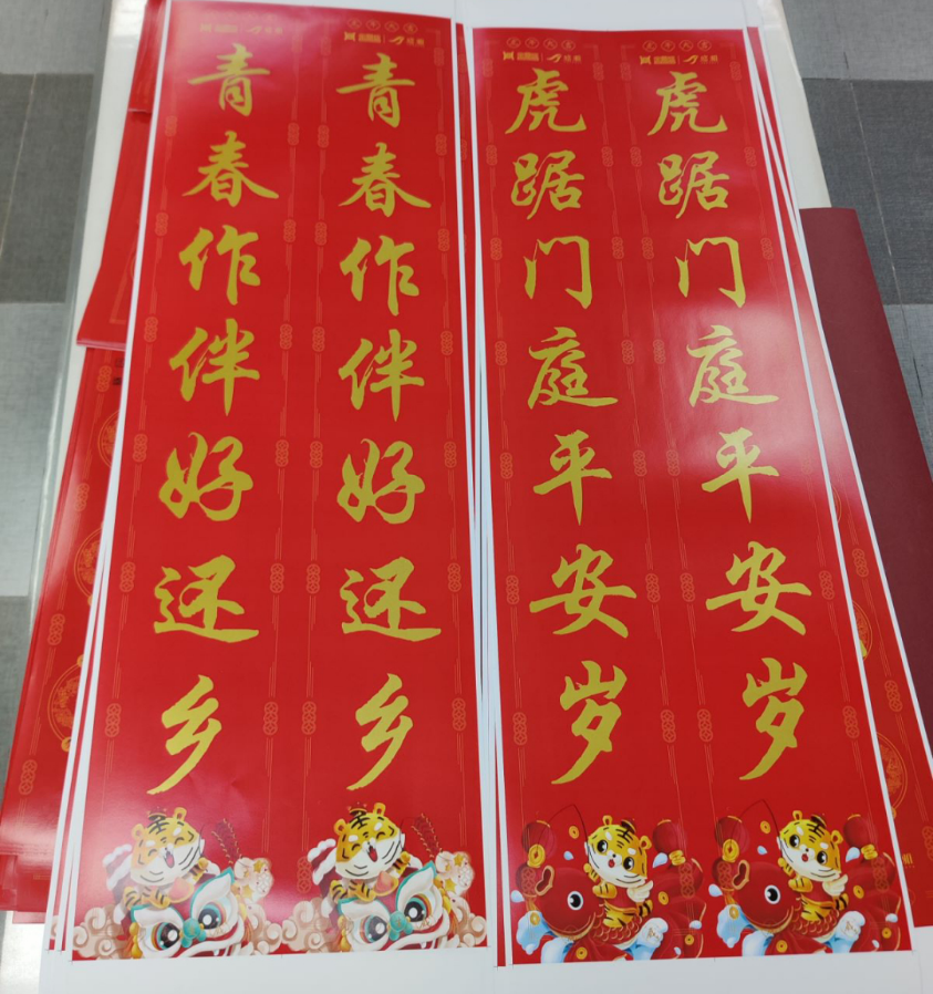 金鼎盛利用Revoria PressTMPC1120独具的一次成像6色技术,用CMYK叠加金、银、白、透明色、霓虹粉和中国红中的任意两色就能开发各种金属色等丰富的特殊色工艺,设备宽泛的介质适应范围让金鼎盛承接了更多新业务。一家西安客户得知金鼎盛装机了Revoria PressTMPC1120,专程找上门,指定用1.2米长的特种纸印金字对联,1500套对联金鼎盛只用了三天就全部印好了,客户非常满意,直言:“Revoria PressTMPC1120印的金色效果和质感比印刷机都好。”