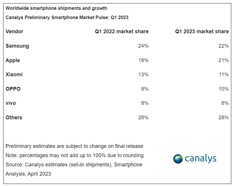 Canalys :2023年第1季度全球智能手机市场同比下滑12%