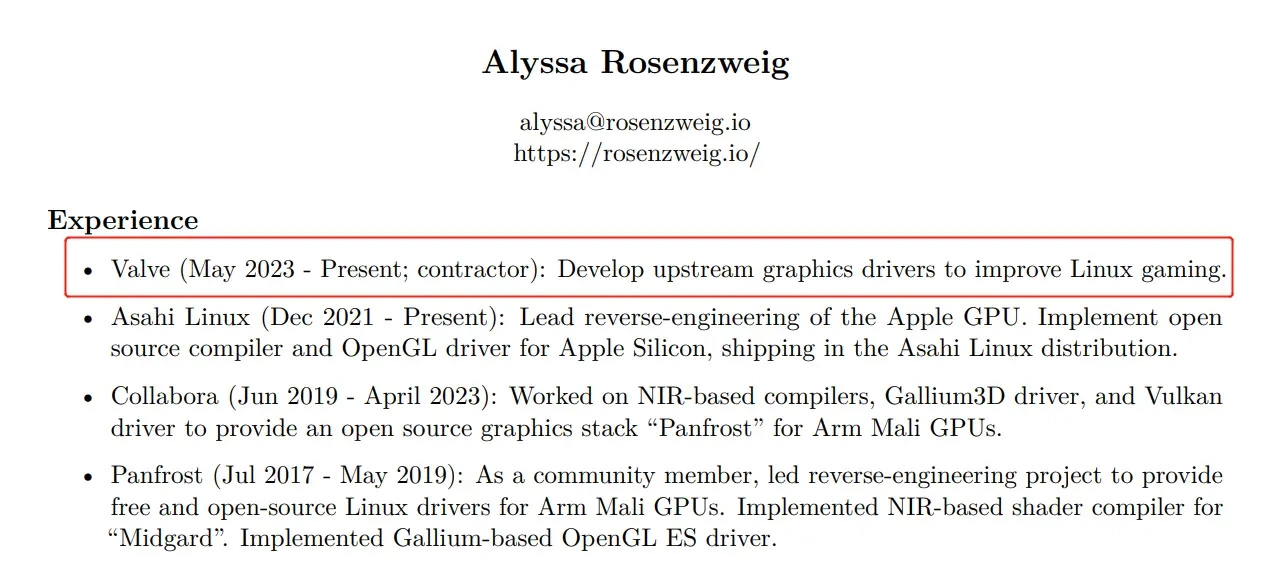 但在此前 4 月份,Alyssa Rosenzweig 宣布辞去 Panfrost 驱动程序维护人员的职务,同时也离开了 Collabora。而近日 Alyssa 更新了简历,资料显示她现在受聘于 Valve,负责处理上游图形驱动程序的开发,未来她的名字很可能在 Steam 客户端或者 Valve 旗下游戏的致谢中出现。