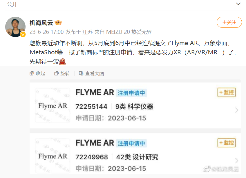 时隔今日,据消息称魅族也在5月底到6月中连续提交了Flyme AR、万象桌面、MetaShot等新商标注册申请,这或许意味着魅族的AR产品也已经在路上了,在这个推崇万物互联的时代,AR技术也是其中重要的一环,借助以往魅族对产品精益求精的态度,我们有理由期待魅族将会在新的XR产品的外观、技术功能上带来惊喜!