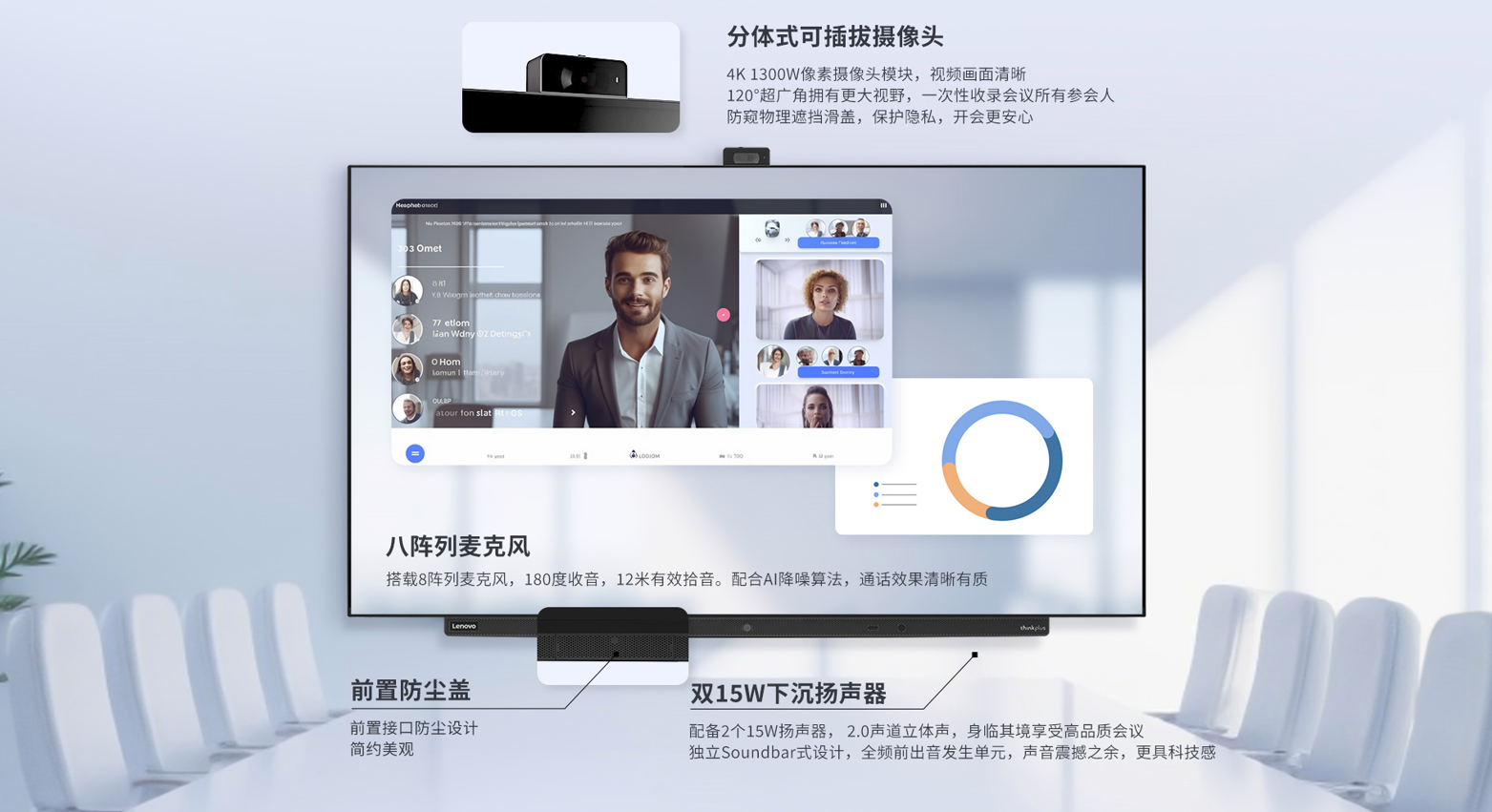 在联想thinkplus会议平板P65+的设计上,除了外观的简约之外,更有着实用性与功能性的“不简单”——P65+上全新采用的模块化设计,在功能拓展层面,为用户提供了更大的灵活性。配备可插拔的分体式摄像头,搭载1300万像素的4K 120度超广视角,更搭配8阵列智能降噪麦克风,实现高质量的视频和音频通信。