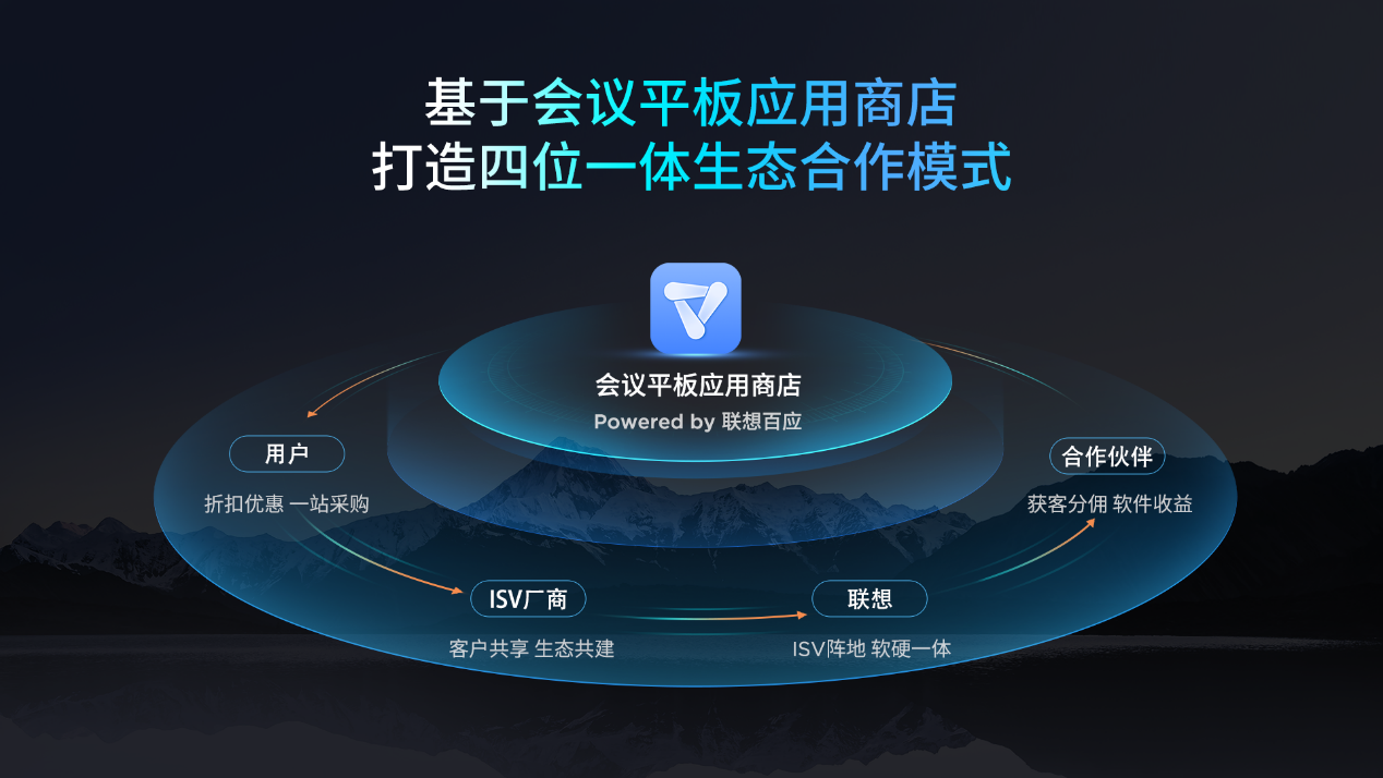 在平台方面,联想thinkplus依托大屏领域的生态与联想百应的APP能力支持,推出会议平板应用商店。为用户端,提供以优惠价格获取付费ISV适配软件的APP商店;为渠道端,提供全新的经营与收入的模式,让渠道获得thinkplus在拓展ISV软件的过程中实现的分佣;为ISV厂商端,提供触达thinkplus会议平板用户的核心阵地,从软件预装、软件推荐、到软件认证与辐射覆盖,创造生意机会;更为thinkplus品牌端,实现业务模式的重要迭代,打造一个“用户、渠道、ISV、thinkplus”四维一体的开放平台,实现领域内的创新生态。更诚邀更多的ISV厂商共同加入深度合作的“领航者联盟计划”。