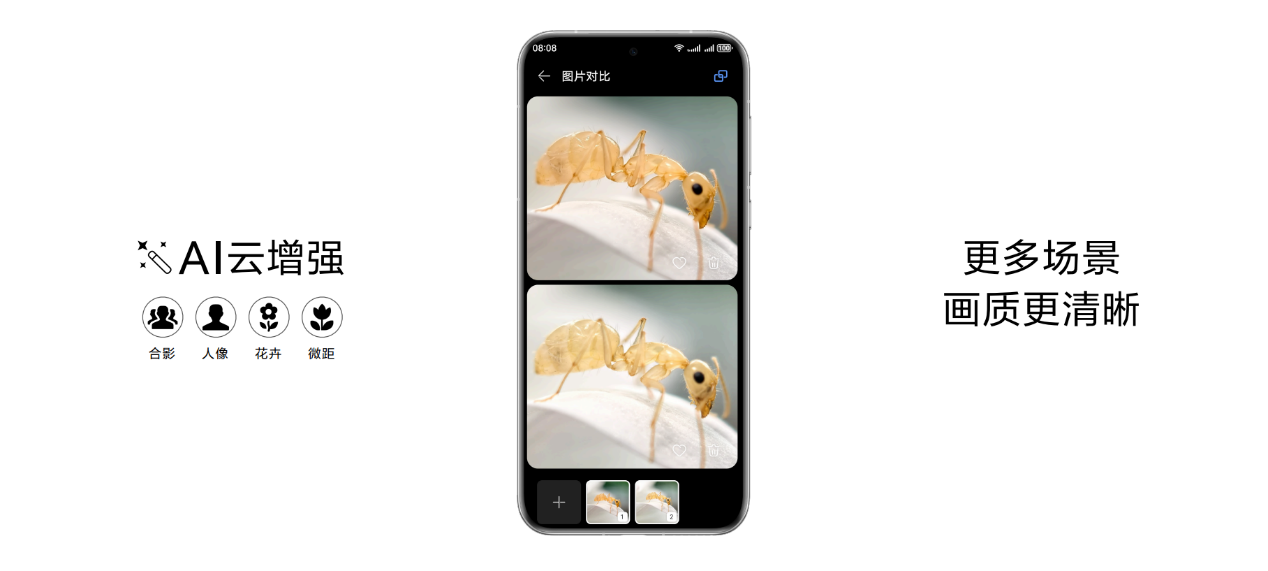 超聚光微距长焦摄像头,长焦也支持超高速风驰闪拍,并实现5cm的最近对焦距离,35x超级微距和200倍变焦范围(0.5x~100x),配合F2.1超大光圈,实现全焦段超清影像。HUAWEI Pura 70 Ultra还拥有高动态视频能力。