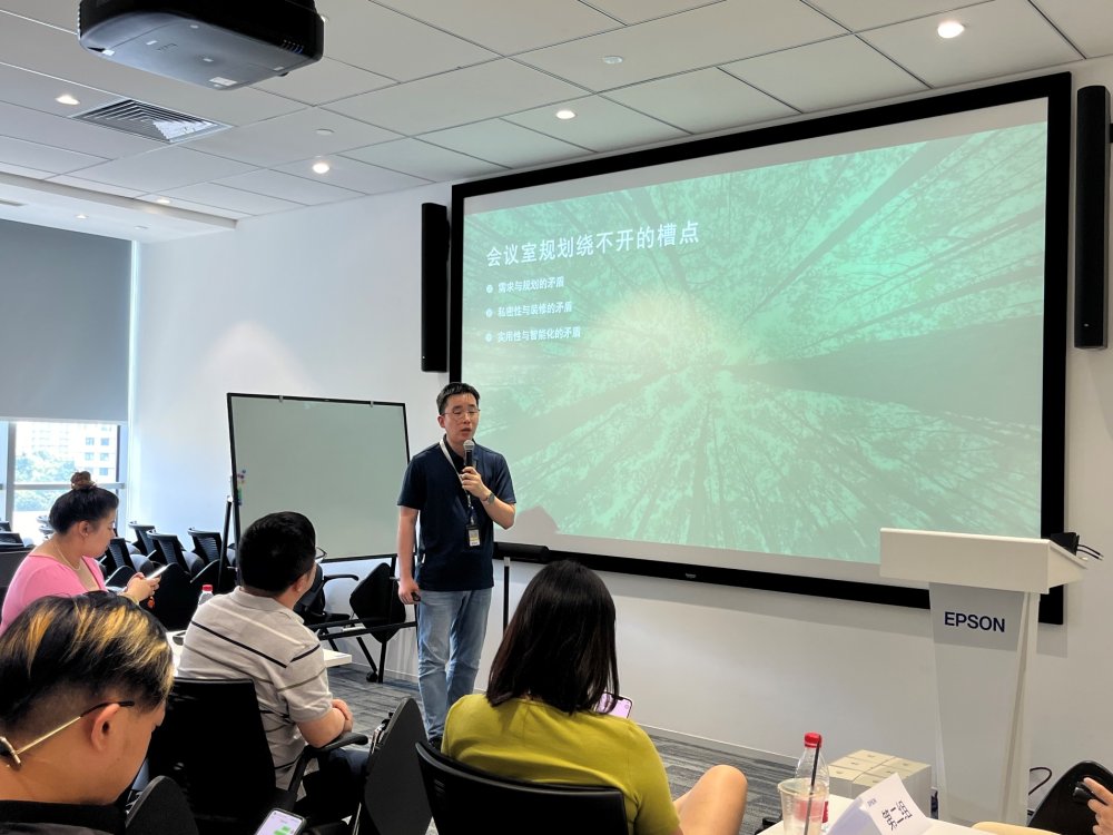 小组共创环节之后,爱普生 (中国) 有限公司商教投影机市场部经理韩林峰《别人家的会议室是怎样的?》为题,分享了爱普生以及客户典型会议室场景设计及其理念,给在场的朋友们一些灵感启发。