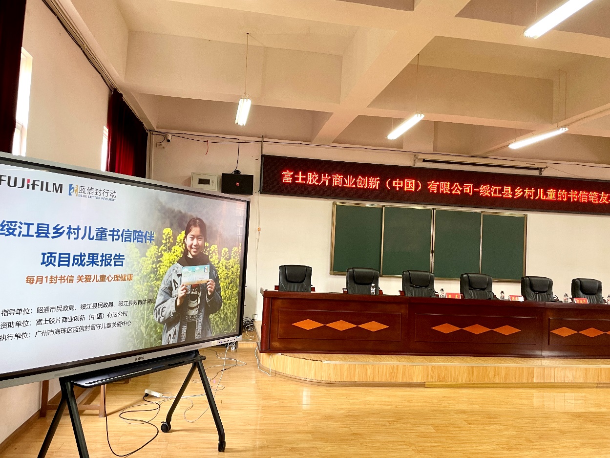 2023 年 3 月,“蓝信封”在昭通市民政局、绥江县民政局和绥江县教体局的推荐和指导下,开始在绥江县开展乡村学生心理陪伴公益活动。目前,该项目已覆盖绥江县 16所乡村学校共计1636 名学生,往来信件总数达25,787封。新一期绥江县“乡村儿童书信陪伴”项目在绥江县当地政府的支持下,由蓝信封留守儿童关爱中心组织发起,富士胶片商业创新(中国)有限公司提供资助,并组织数十位员工志愿者为当地学生提供书信陪伴,用实际行动践行集团使命“为世界绽放更多笑容”。