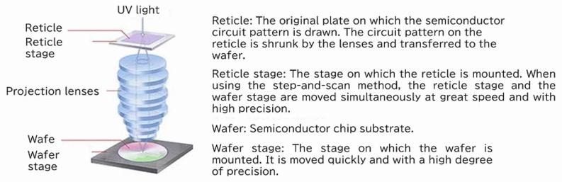 将带有电子电路图的掩模板(母版)放置在掩模工作台上、半导体基板放置在晶圆载物台上,从上方用UV光(紫外线)照射,穿过掩模板的紫外线会透过投影光学系统,在半导体基板上形成掩模板上的电子电路图的图像。被叫做晶圆的半导体基板上涂有光刻胶(光刻胶在紫外线照射下会改变其特性),在掩模板上绘制的电子电路图案会被转印到光照到的地方。