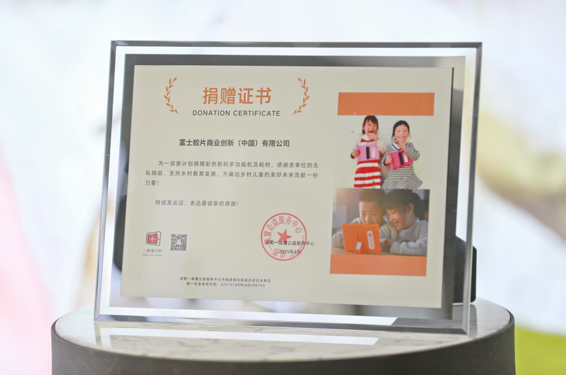 今天,富士胶片商业创新(中国)有限公司与成都一扇窗公益服务中心举行了“富士胶片商业创新(中国) X 一扇窗计划”爱心捐赠仪式。富士胶片商业创新(中国)董事长兼总裁中村达也、副总裁朱德康代表公司向“一扇窗”及其帮扶学校河南周口小学捐赠了彩色数码多功能机及耗材,该设备将用于乡村师生、城市志愿者打印彩色证书、教学资料等。这是富士胶片商业创新(中国)致力于解决社会问题、利用业务优势支持弱势群体教育,为乡村儿童绽放更多笑容的又一举措。