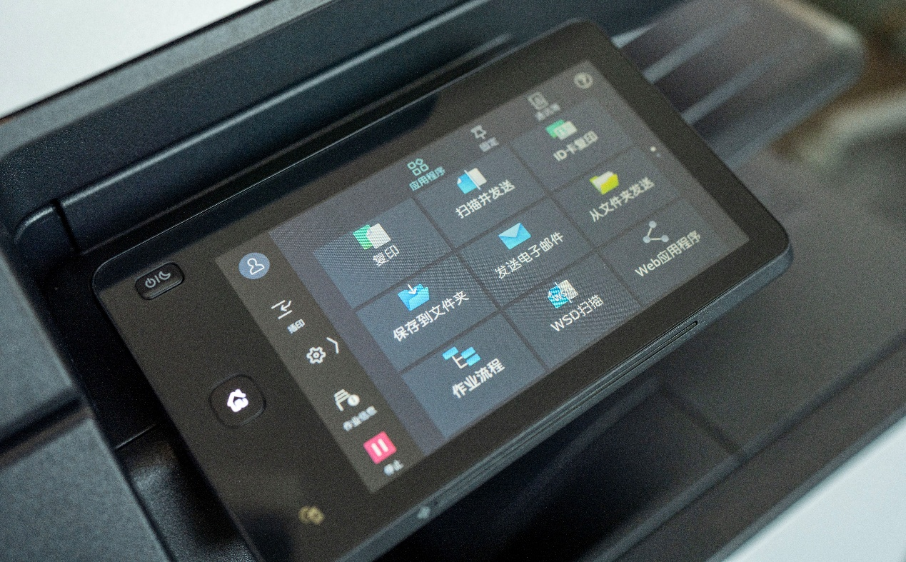 配备了7英寸的智能操作面板,借鉴平板设备的设计理念,扁平图标采用带有阴影的色彩效果,不仅视觉上更具吸引力,而且大大提升了可视性与可用性。用户可以通过面板实现直观的操作体验,还能根据个人使用习惯进行个性化定制。控制面板还提供网关功能,支持NFC触控区连接移动设备,通过智能手机用户可轻松执行复印、传真、打印、扫描等基本操作,提高打印便利性和安全性。设备还支持应用程序按钮固定功能,用户可以将常用设置保存到主屏幕上,更符合用户的长期使用习惯。