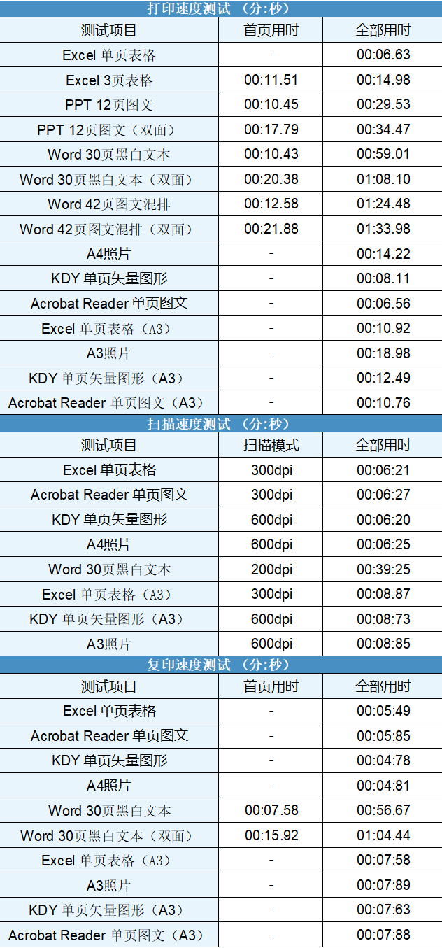在测试中,A4单面打印单页只需要6.6秒,连续30页WORD速度为59秒(单面),PPT输出首页10.45秒,连续12页为29.53秒。扫描方面,单页A4扫描仅需6.21秒,600dpi下A3照片也只要8.85秒,30页连续文档的扫描只需要39秒。对于广大中小企业的日常文印来说,可以实现更高的工作效率。