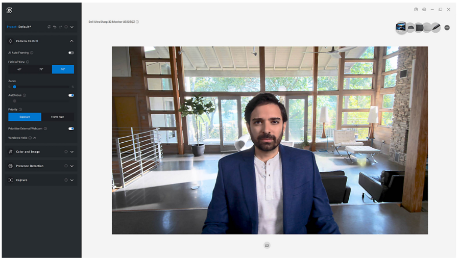 在视频会议方面,戴尔U3223QZ视频会议显示器采用全新UltraSharp 4K网络摄像头WB7022。这款4K 高动态范围(HDR)网络摄像头配备了大型4K Sony STARVIS™ CMOS传感器,同时具备用于光线调节的Digital Overlap HDR技术、AI智能自动取景功能、一体化智能安全功能和3D/2D视频图像降噪功能,可以有效消除运动模糊,塑造出色画质。戴尔U3223QZ显示器内置双回声消除麦克风和两个14 W扬声器,用户能够尽享出色的音频清晰度,让远程协作如临现场。用户还可以根据自己的偏好,利用Dell Peripheral Manager 轻松进行一系列出色功能的个性化设置,如HDR、AI智能自动取景、不同的视野和预设。摄像头捕捉范围也可依据喜好自行调整,有65°、78°或90°等视野可供选择。