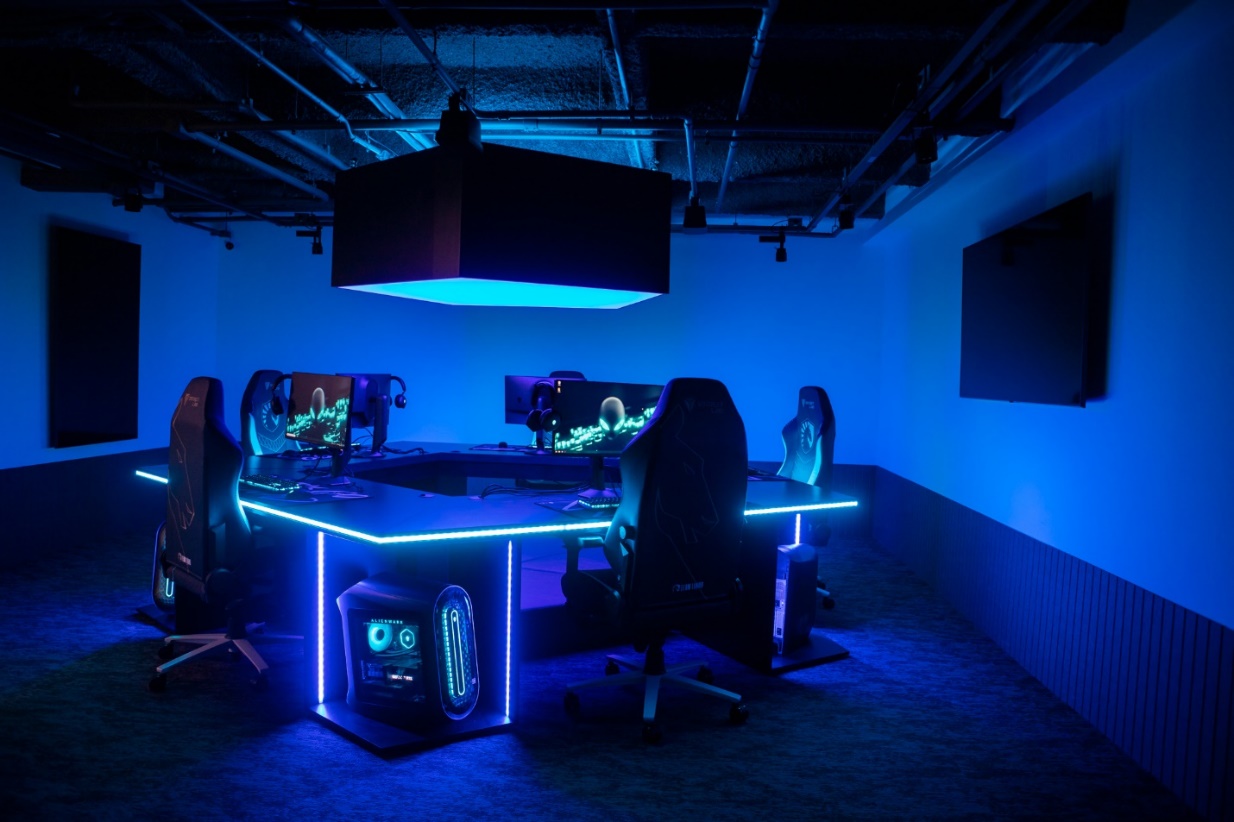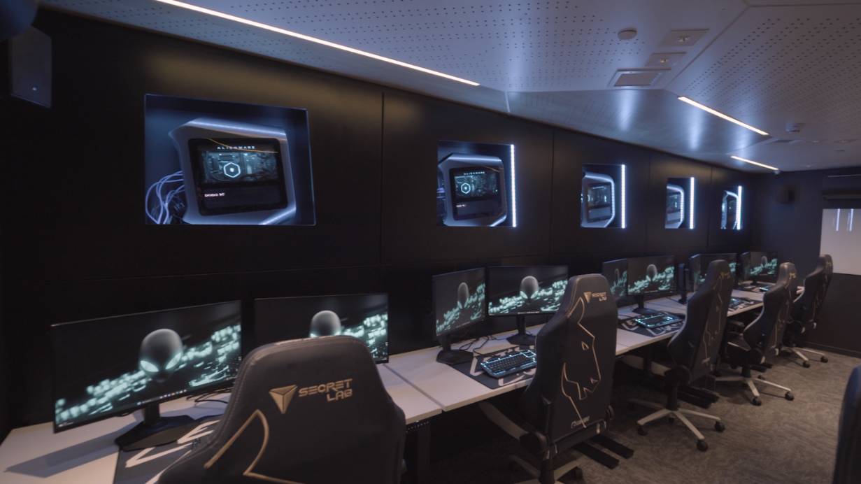 该基地还提供了一个完全用于运动员训练的楼层,房间里配备了ALIENWARE Aurora R15台式机。这些练习室附带两间评估室,教练和分析师将在那里进行战绩和表现审查。此外,配有高性能设备的隔音流媒体室,包括三台摄像机和麦克风,可供运动员在互联网上制作内容和直播。