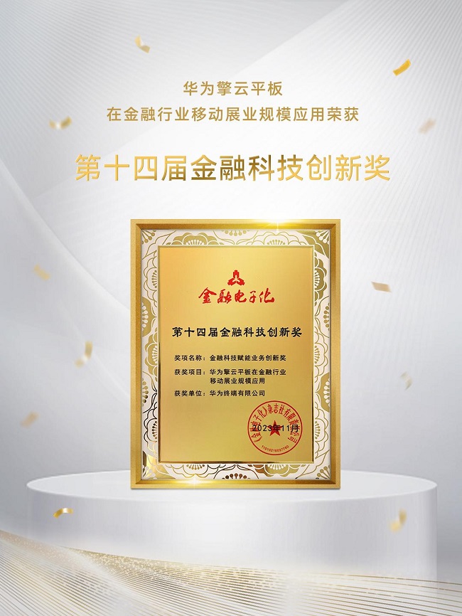 在金融领域,越来越多的金融客户利用手持终端设备完成诸如开卡、信息录入和理财产品购买等常规业务办理,拓展了银行、证券、保险等金融细分领域的“移动营销”场景,打通了金融服务的“最后一公里”。其中华为擎云商用平板凭借安全可靠、高效便捷、开放定制等诸多特性,以及在金融行业移动展业领域的规模化应用荣获中国人民银行主管金融信息科技类期刊《金融电子化》杂志社颁发的“第十四届金融科技创新奖”。