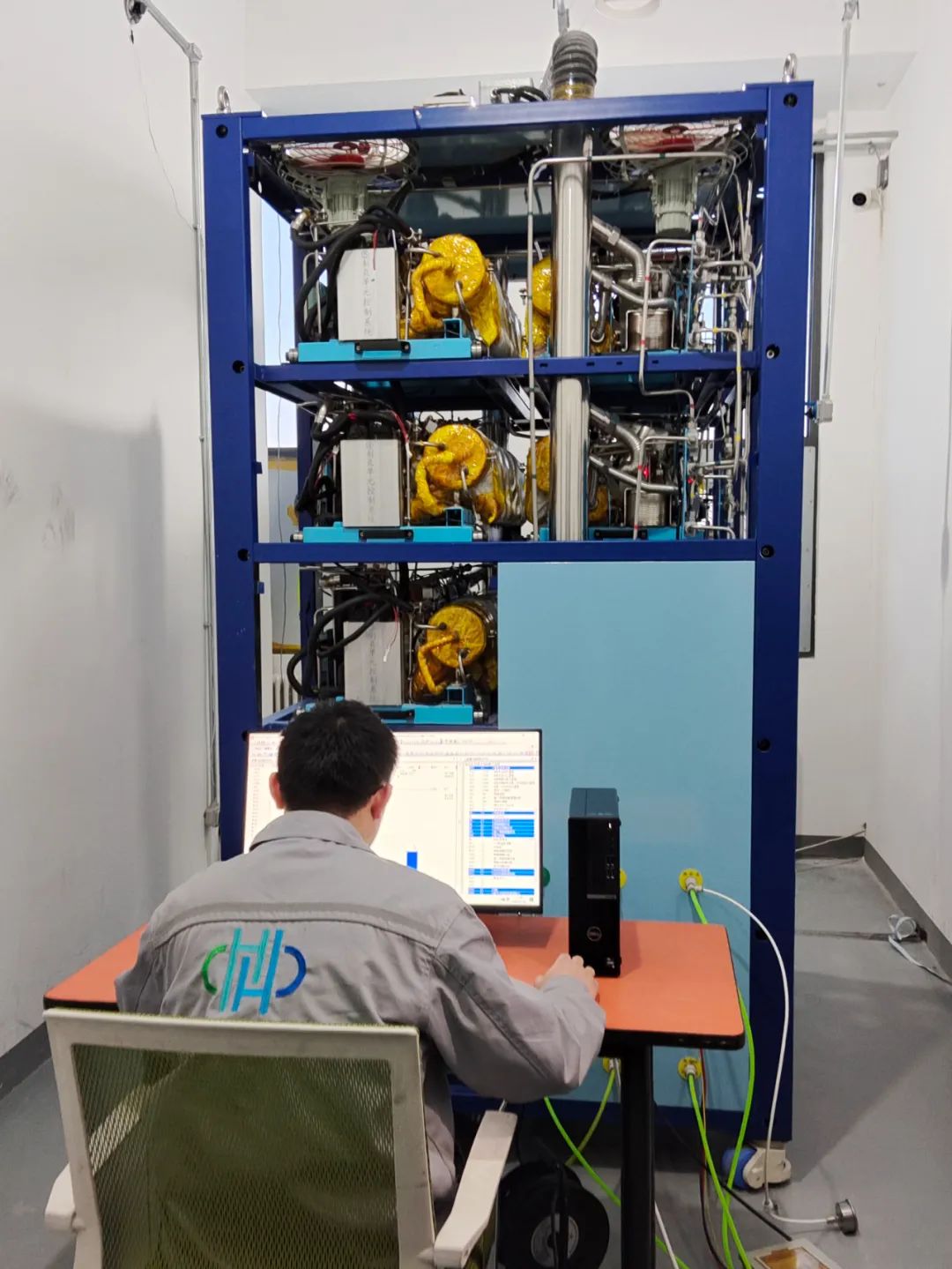 在模块式甲醇重整制氢燃料电池设备出厂之前,中氢新能都要在专门的测试车间里,通过制氢单元控制系统对电池设备进行调试,从而保障电池性能达到最优。