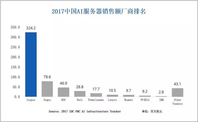 由于在AI领域前瞻投入和布局,浪潮已经成为中国最大的AI基础架构供应商,2017年中国市场占有率达57%;